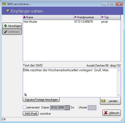 wählen, Text eingeben und per Mausklick wird die SMS versendet.